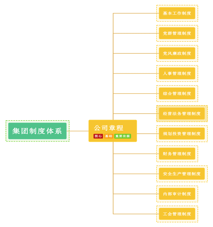 实行“会前规章制度合规审核”模式,确保制度科学合理可执行。规范制度审批,按照制度类别和效力层级,建立起由股东、党委会、董事会、总经理办公会分级审批的决策机制。开展定期制度评估,进一步完善优化包含党政管理类、人力资源管理类、综合管理类、经营法务管理类、财务管理类、安全生产管理类等十一个方面的125项制度。